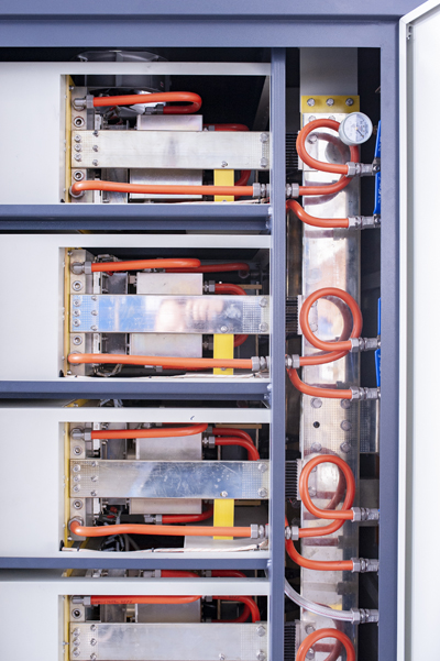 的特殊环境(空气潮湿且呈酸性)而设计制造,柜体采用全封闭制作,防附等级达IP54等级。冷却方式采用水冷,且柜体内采用输