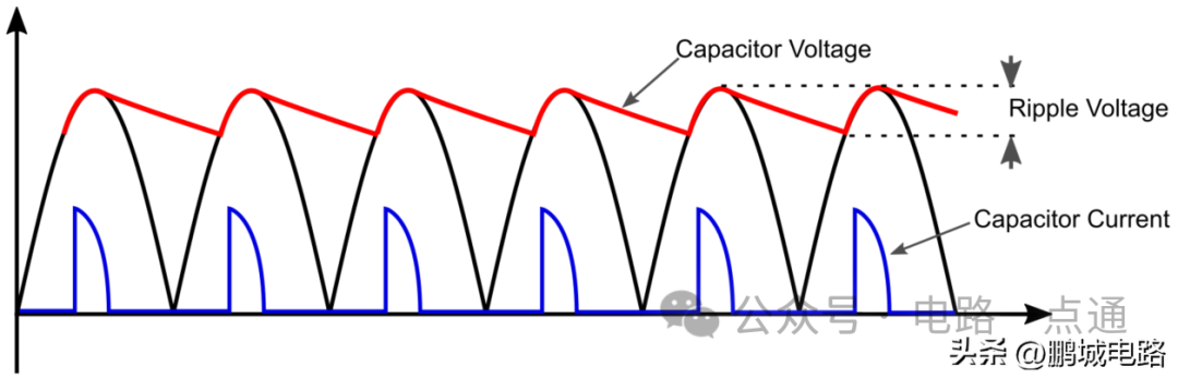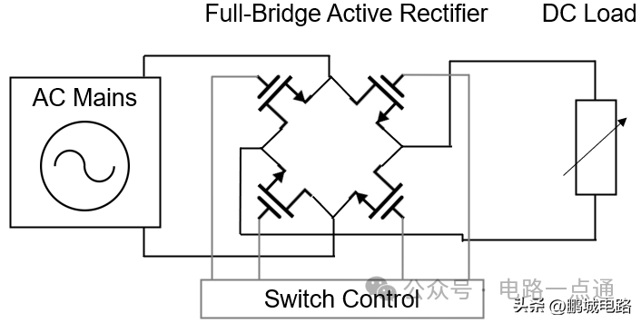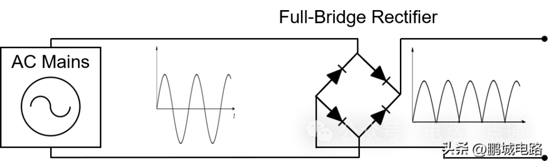 整流是将交流电压转换为直流电压的过程。输入信号的整流是开关模式AC / DC电源的第一步。直流电压通常被认为是恒定的直线电压,就像电池提供的电压那样。但实际上,直流电(DC)被定义为单向电荷流。这意味着直流电压沿同一方向流动,但不一定是恒定的。正弦波交流电(AC)正弦波是最典型的电压波形,其前半周期为正,后半周期为负。如果负半周期反相或消除,则电流将停止交替,变为直流电。这个转换过程可以通过整流来实现。利用无源半桥整流器中的二极管,可以消除正弦波的负半部分,从而实现整流(参见图2)。二极管允许电流在波的正半周期通过,并在电流沿相反方向流过时截止电流。正弦波经过整流后将具有较低的平均功率,无法有效为设备供电。另一种更有效的方法是改变负半波的极性,将其变为正波。这种方法称为全波整流,它只需要四个二极管做全桥配置即可(见图3)。不管输入电压的极性如何,这种配置都可以确保稳定的电流方向。相比半桥整流,经过全波整流的波形平均输出电压更高,但仍与电子设备供电所需的恒定直流波形相差甚远。尽管它已经是一个直流波形,但从电压波的形状可以看出,电压变化非常快而且频繁,用这样的直流电为设备供电效率会很低。直流电压的这种周期性变化称为纹波,减少或消除纹波对于实现高效电源至关重要。减少纹波最简单、最常用的方法是在整流器输出端添加一个大电容,称为储能电容器或平滑滤波器(见图4)。该电容器在波峰期间存储电压,然后为负载提供电流,直到其电压小于正在上升的整流电压波为止。其产生的波形将更接近所需的形状,也可以认为是没有交流分量的直流电压。这个最终的电压波形就可以为直流设备供电了。无源整流器采用半导体二极管作为非受控开关,这是最简单的交流波整流方法,但并不是最有效的方法。二极管是相对高效的开关。它们能够以最小功耗快速导通和关断。但它唯一的问题是存在0.5V至1V的正向偏置压降,这会降低效率。有源整流器采用可控开关代替了二极管,例如MOSFET或BJT晶体管(见图5)。它有两个优势:首先,晶体管整流器没有半导体二极管固有的0.5V至1V压降,因为其电阻可以任意小,因此压降也很小;其次,晶体管是受控开关,这意味着开关频率可以调节,并进而优化。其缺点是,有源整流器需要更复杂的控制电路才能实现其目标,这需要额外的组件,因此成本更高。