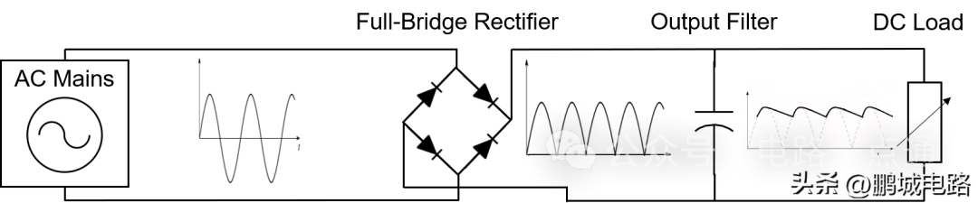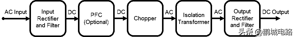 DC电源一直被用于将公用电网的交流电转换为直流电,用于家用电器或照明用电。但大功率应用越来越需要更小的电源。线性电源被降级到特定的工业和医疗用途中,因其低噪声让它在这类应用中仍有用武之地;而开关电源因为体积小、效率高并且能够处理大功率,已经很大程度上替代了线性电源。图1阐明了在开关电源中,交流电(AC)到直流电(DC)的一般转换过程。