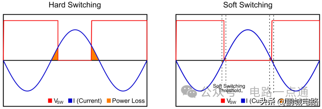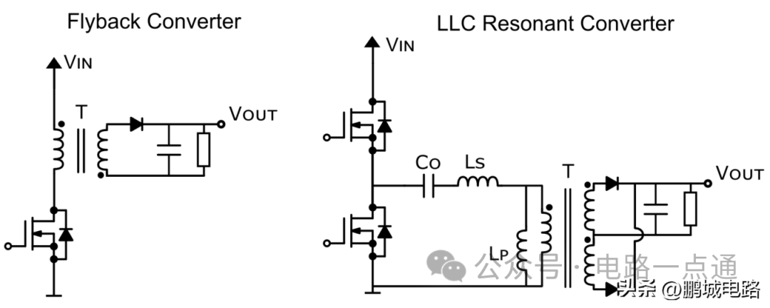 电源的输入端连接到交流电力干线,这意味着如果输出端漏电,这种程度的电击会导致人员严重伤害甚至死亡,而且会损坏连接到输出端的任何设备。将连接电力干线的AC / DC电源输入和输出电路磁隔离可以确保安全。隔离式AC / DC电源中应用最广泛的电路是反激变换器和谐振LLC变换器,因为它们均具有电隔离或磁隔离(请参见图7)。采用变压器意味着信号不能是平坦的直流电压。相反,电压必须变化,因此电流也必须变化,这样才能通过感应耦合将能量从变压器的一侧传递到另一侧。因此,反激变换器和LLC变换器都将输入直流电压“斩波”为方波,然后再通过变压器降压。最后,在输出之前,再次对波形进行整流。反激变换器主要用于低功率应用,它也是一种隔离式降压-升压变换器,其输出电压可以高于或低于输入电压,具体取决于变压器的初级绕组与次级绕组之间的匝数比。当开关闭合时,初级线圈通过输入进行充电并形成磁场;当开关打开时,初级电感器中的电荷转移到次级绕组,次级绕组向电路中注入电流,从而为负载供电。反激变换器相对而言较易设计,相比其他变换器需要的组件更少,但它效率不高,因为它强制晶体管任意导通和关断,这种硬切换会造成巨大的损耗(参见图8)。特别是在大功率应用中,这会缩短晶体管寿命,并产生巨大的功耗。因此,反激变换器更适合功率通常最高100W的低功率应用。谐振LLC变换器则普遍应用于大功率应用。其电路也通过变压器进行磁隔离。LLC变换器基于谐振现象,即当工作频率与滤波器固有频率匹配时,该频率将被放大。在这种情况下,LLC变换器的谐振频率由串联的电感与电容(LC滤波器)定义,同时还受变压器初级电感(L)的附加作用影响,因此被命名为LLC变换器。LLC谐振变换器是大功率应用的首选,因为它们可以产生零电流开关,也称为软开关(见图8)。当电路中的电流接近零时,它可以导通和关断开关,将晶体管的开关损耗降至最低,从而降低EMI并提高效率。不过,这种性能的提升需要付出一定的代价:设计能够在各种负载条件下实现软开关的LLC谐振变换器非常困难。为此,MPS开发了一种特殊的LLC设计工具,它可以确保变换器在正确的谐振状态下工作,从而实现更佳开关效率。前文提到过,AC / DC电源的局限性之一是输入变压器的尺寸和重量。这是因为输入变压器的低工作频率(50Hz)需要较大的电感器和磁芯,才能避免饱和。在开关电源中,电压的振荡频率明显更高(至少高于20kHz)。这意味着降压变压器可以更小,因为高频信号在线性变压器中产生的磁损耗较小。输入变压器的尺寸变小了,系统就可以小型化,才有可能实现将整个电源都装进手机充电器中,就像我们现在所使用的。有些直流设备并不需要变压器提供隔离。这在不需要用户直接触摸的设备(例如灯、传感器、IoT等)中很常见,因为对设备参数的任何处理都是在单独的设备(例如手机、平板电脑或计算机)上完成的。这对设备的重量、尺寸和性能都有很大益处。这些变换器利用高电压降压变换器降低了输出电压水平。其电路可以认为是之前提到的升压变换器的反相电路。在这种情况下,当晶体管开关闭合时,流经电感的电流会在电感两端产生一个电压,它会抵消来自电源的电压,从而降低输出端的电压。当开关打开时,电感释放电流供给负载,在电路与电源断开时保持负载上的电压值。AC