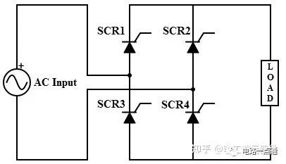 在输入的正半周期内,SCR1 正向偏置,SCR2 反向偏置。通过施加适当的栅极信号,SCR1 开启,因此负载电流开始流过它。