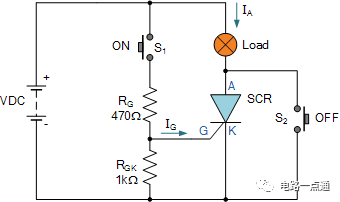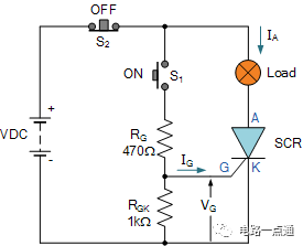 晶闸管正向偏置,并通过短暂关闭常开“ON”按钮S1触发导通,该按钮通过栅极电阻 RG将栅极端子连接到直流电源,从而允许电流流入栅极。如果 RG 的值相对于电源电压设置得太高,晶闸管可能不会触发。