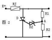 如图2是一个电视机常用的过压保护电路,当E 电压过高时A点电压也变高,当它高于稳压管DZ的稳压值时DZ道通,可控硅D受触发而道通将E 短路,使保险丝RJ熔断,从而起到过压保护的作用。