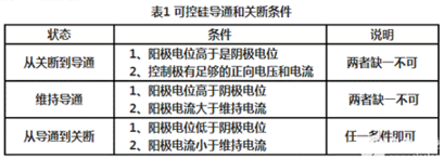 由于可控硅只有导通和关断两种工作状态,所以它具有开关特性,这种特性需要一定的条件才能转化,此条件见表1
