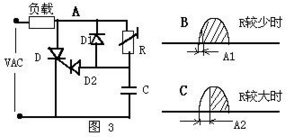 相位触发电路实际上是交流触发电路的一种,如图3,这个电路的方法是利用RC回路控制触发信号的相位。当R值较少时,RC时间常数较少,触发信号的相移A1较少,因此负载获得较大的电功率;当R值较大时,RC时间常数较大,触发信号的相移A2较大,因此负载获得较少的电功率。这个典型的电功率无级调整电路在日常生活中有很多电气产品中都应用它。