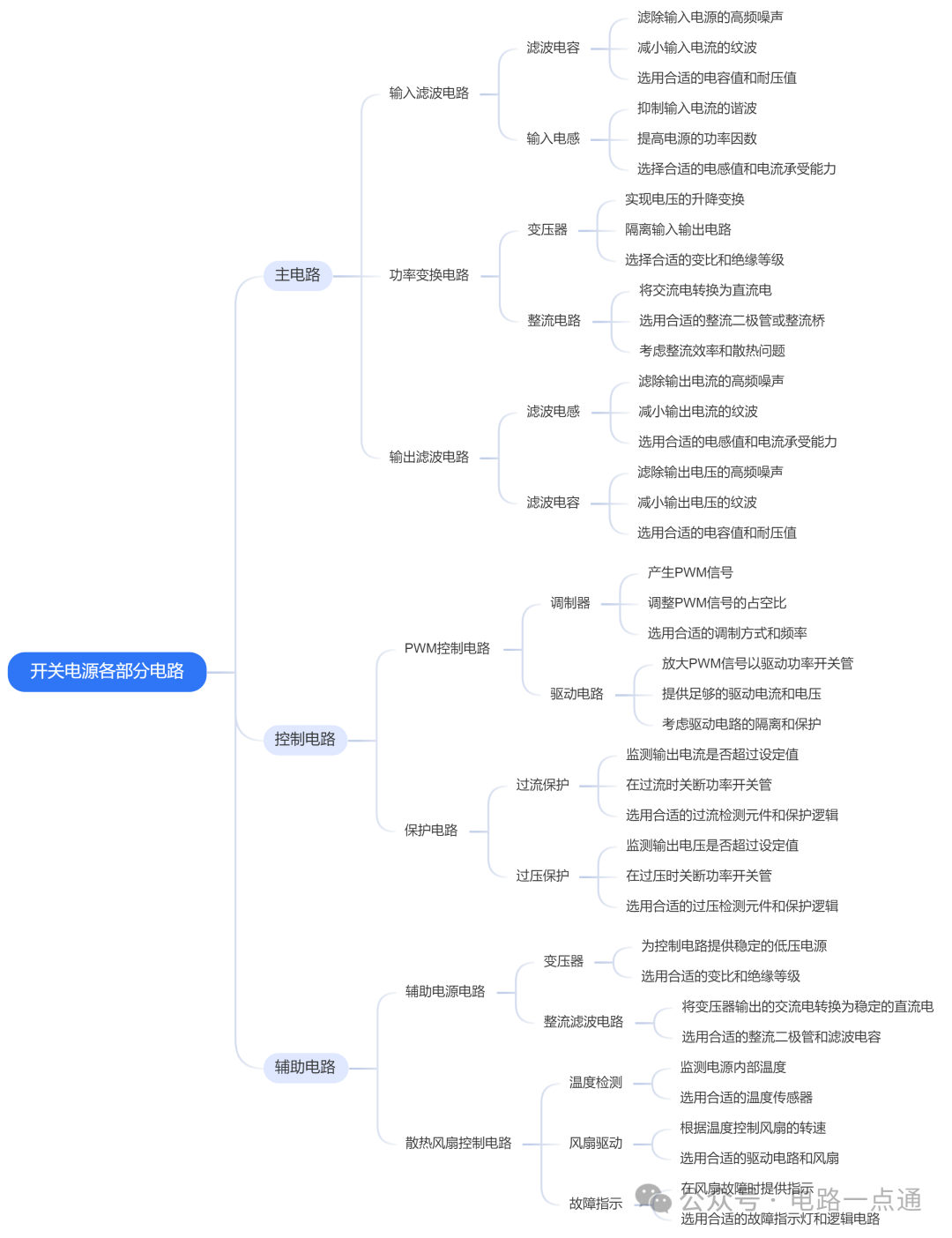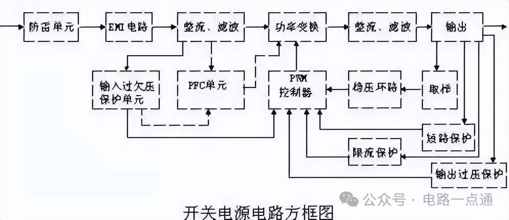 开关电源的主要电路是由输入防雷电路、EMI铝箔电路、桥式整流滤波电路、主电路(功率变换电路)、PWM控制器电路(现在一般是采用芯片输出)、输出整流滤波电路、反馈电路组成。辅助电路有输入过欠压保护电路、输出过欠压保护电路、输出过流保护电路、输出短路保护电路等。