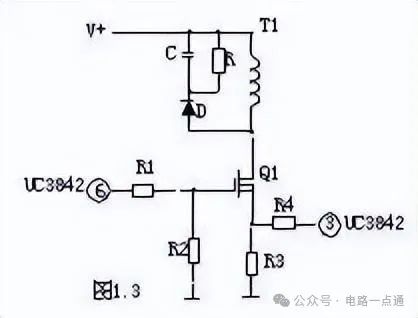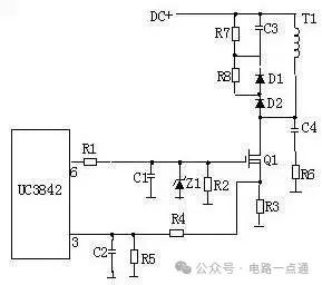 R4、C3、R5、R6、C4、D1、D2组成缓冲器,和开关MOS管并接,使开关管电压应力减少,EMI减少,不发生二次击穿。在开关管Q1关断时,变压器的原边线圈易产生尖峰电压和尖峰电流,这些元件组合一起,能很好地吸收尖峰电压和电流。从R3测得的电流峰值信号参与当前工作周波的占空比控制,因此是当前工作周波的电流限制。当R5上的电压达到1V时,UC3842停止工作,开关管Q1立即关断。R1和Q1中的结电容CGS、CGD一起组成RC网络,电容的充放电直接影响着开关管的开关速度。R1过小,易引起振荡,电磁干扰也会很大;R1过大,会降低开关管的开关速度。Z1通常将MOS管的GS电压限制在18V以下,从而保护了MOS管。Q1的栅极受控电压为锯形波,当其占空比越大时,Q1导通时间越长,变压器所储存的能量也就越多;当Q1截止时,变压器通过D1、D2、R5、R4、C3释放能量,同时也达到了磁场复位的目的,为变压器的下一次存储、传递能量做好了准备。IC根据输出电压和电流时刻调整着⑥脚锯形波占空比的大小,从而稳定了整机的输出电流和电压。C4和R6为尖峰电压吸收回路。