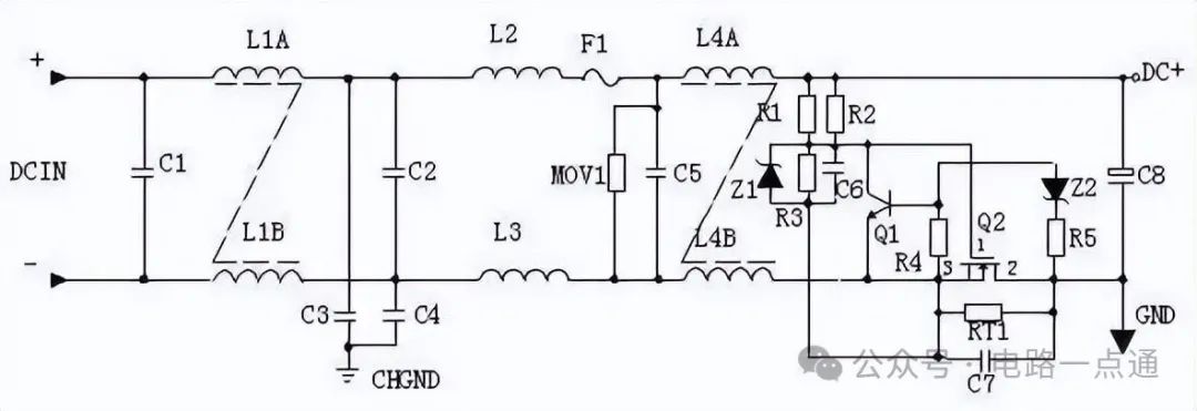 ②、R1、R2、R3、Z1、C6、Q1、Z2、R4、R5、Q2、RT1、C7组成抗浪涌电路。在起机的瞬间,由于C6的存在Q2不导通,电流经RT1构成回路。当C6上的电压充至Z1的稳压值时Q2导通。如果C8漏电或后级电路短路现象,在起机的瞬间电流在RT1上产生的压降增大,Q1导通使Q2没有栅极电压不导通,RT1将会在很短的时间烧毁,以保护后级电路。