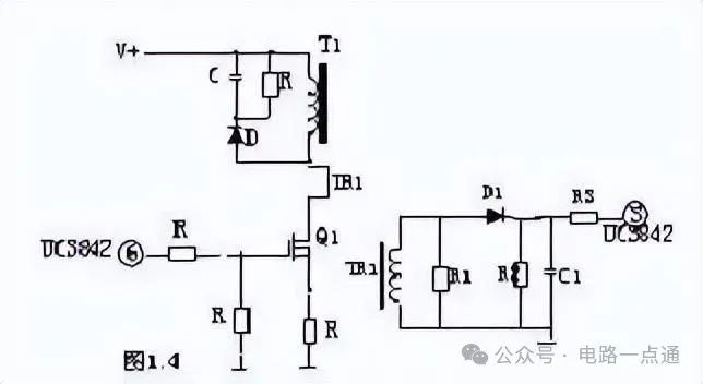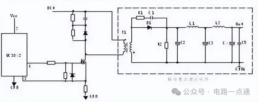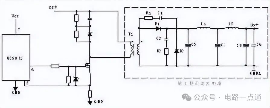 T1为开关变压器,其初极和次极的相位相反。D1为整流二极管,R1、C1为削尖峰电路。L1为续流电感,R2为假负载,C4、L2、C5组成π型滤波器。