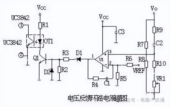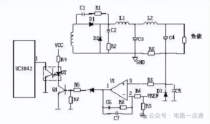 当输出U0升高,经取样电阻R7、R8、R10、VR1分压后,U1③脚电压升高,当其超过U1②脚基准电压后U1①脚输出高电平,使Q1导通,光耦OT1发光二极管发光,光电三极管导通,UC3842①脚电位相应变低,从而改变U1⑥脚输出占空比减小,U0降低。当输出U0降低时,U1③脚电压降低,当其低过U1②脚基准电压后U1①脚输出低电平,Q1不导通,光耦OT1发光二极管不发光,光电三极管不导通,UC3842①脚电位升高,从而改变U1⑥脚输出占空比增大,U0降低。周而复始,从而使输出电压保持稳定。调节VR1可改变输出电压值。