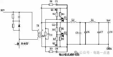 当变压器次级上端为正时,电流经C2、R5、R6、R7使Q2导通,电路构成回路,Q2为整流管。Q1栅极由于处于反偏而截止。当变压器次级下端为正时,电流经C3、R4、R2使Q1导通,Q1为续流管。Q2栅极由于处于反偏而截止。L2为续流电感,C6、L1、C7组成π型滤波器。R1、C1、R9、C4为削尖峰电路。更多资料关注@电路一点通