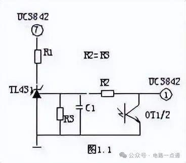 输出电路短路或电流过大,TR1次级线圈感应的电压就越高,当UC3842③脚超过1伏,UC3842停止工作,周而复始,当短路或过载消失,电路自行恢复。