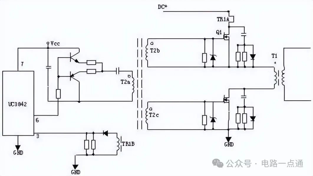 T2为驱动变压器,T1为开关变压器,TR1为电流环。