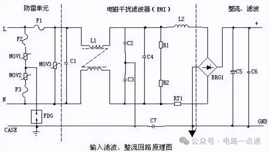 ①、输入滤波电路:C1、L1、C2组成的双π型滤波网络主要是对输入电源的电磁噪声及杂波信号进行抑制,防止对电源干扰,同时也防止电源本身产生的高频杂波对电网干扰。C3、C4为安规电容,L2、L3为差模电感。