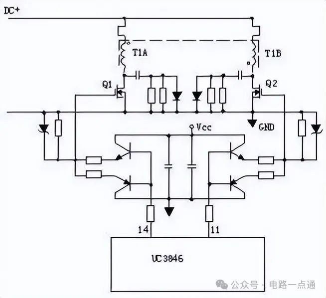 Q1和Q2将轮流导通,要注意的是推挽式对对变压器的耦合要求是很高的,耦合不好会出现偏磁的。