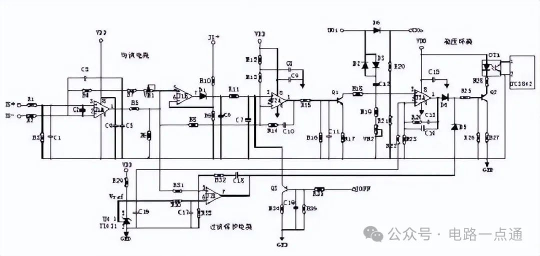 上图是常见的输出端限流保护电路,其工作原理简述如上图:当输出电流过大时,RS(锰铜丝)两端电压上升,U1③脚电压高于②脚基准电压,U1①脚输出高电压,Q1导通,光耦发生光电效应,UC3842①脚电压降低,输出电压降低,从而达到输出过载限流的目的。更多资料关注@电路一点通