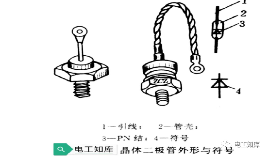 晶体二极管简称二极管,是在本征半导体基片上利用掺杂生成一个P区和一个N区,并在P区和N区安上电极引线,再用外壳(管壳)封装加固后构成的。如下图所示,安于P区的电极称为阳极,安于N区的电极称为阴极。二极管的符号如下图中的4所示。