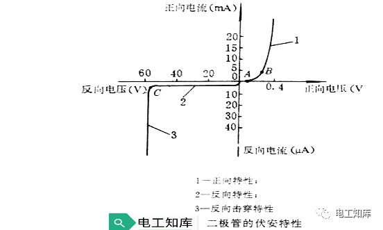 用来描述加在二极管两个电极间的电压U和通过二极管的电流I之间的伏安特性曲线,如下图所示。